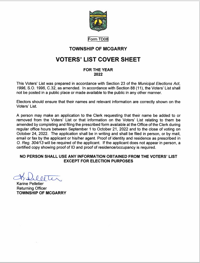 Please monitor our website as we continue to post information regarding the 2022 Municipal Election, If you have any questions, please contact the municipal office at 705-634-2145, or by email at mcgarry.township@ntl.sympatico.ca