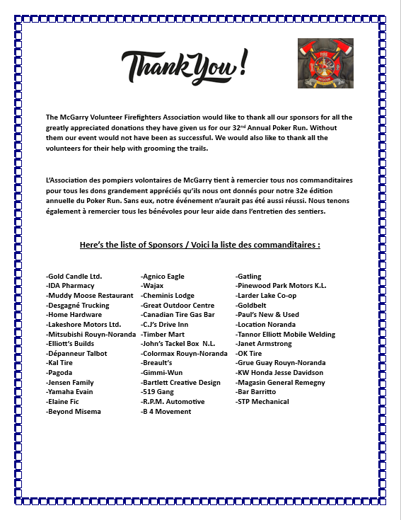 The Township of McGarry has a dedicated crew of volunteer firefighters that are committed to providing fire protection services to our local area and the community at large. The Brigade currently has twenty-two volunteer members. Meetings are held monthly and are not open to the public.